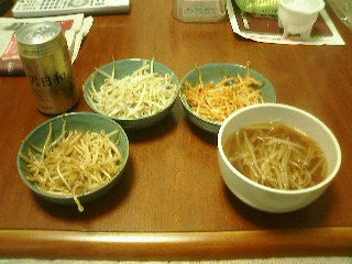 すごい豪勢でしょ。 え? 何かわからんて? いーかー説明するぞ? 左から もやしのオイスターソース炒め。 もやしの塩こしょう炒め。 もやしのキムチ炒め。 もやしの醤油煮。 の4品。