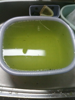 ↑茹で汁を溜めてみた。ちょっとした薬湯か田んぼの水っぽいわ。