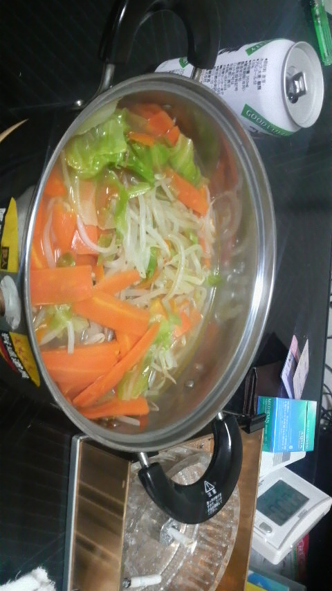 つくり方は簡単。 野菜を炒めて スープ用の水と鶏がらスープの素とホタテ貝柱スープの素と塩を入れて煮る。